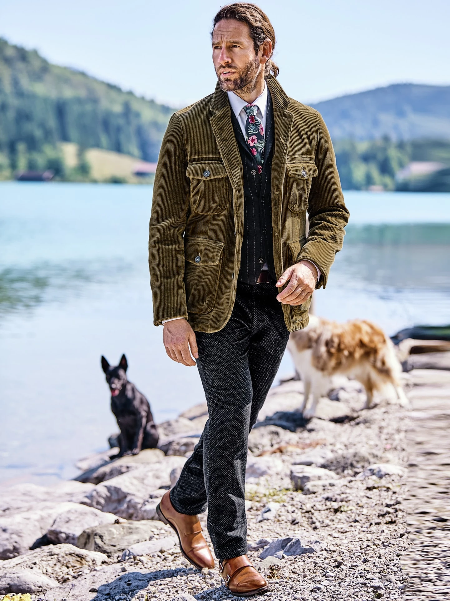 Dieser Stoff hat Charakter. Deshalb ist Cord bis heute einer der beliebtesten Stoffe der Männer- (und Frauen-)Garderobe, steht nach wie vor nicht nur symbolisch für die Zunft der Zimmerleute und wird besonders gern für markige Einzelstücke verwendet. So wie für dieses Sakko. In die voluminösen vier Außentaschen packen Sie alles, was Sie brauchen: vom Winkelmesser bis zur Sparrenzwinge, von Papieren bis Telekommunikationsgerät. Der Cord stammt übrigens vom westfälischen Familienunternehmen Kindermann aus Ibbenbüren. Leicht gefüttert, so tragen Sie das Sakko noch gut bis in den November hinein als Jackenersatz.