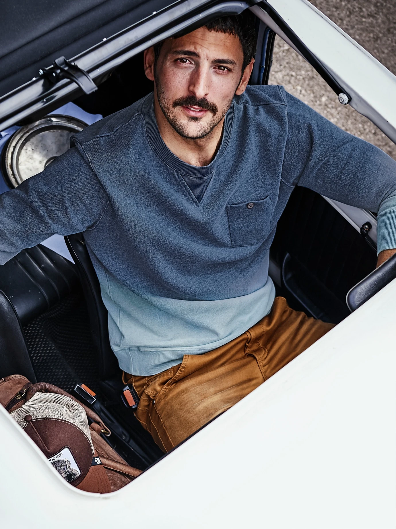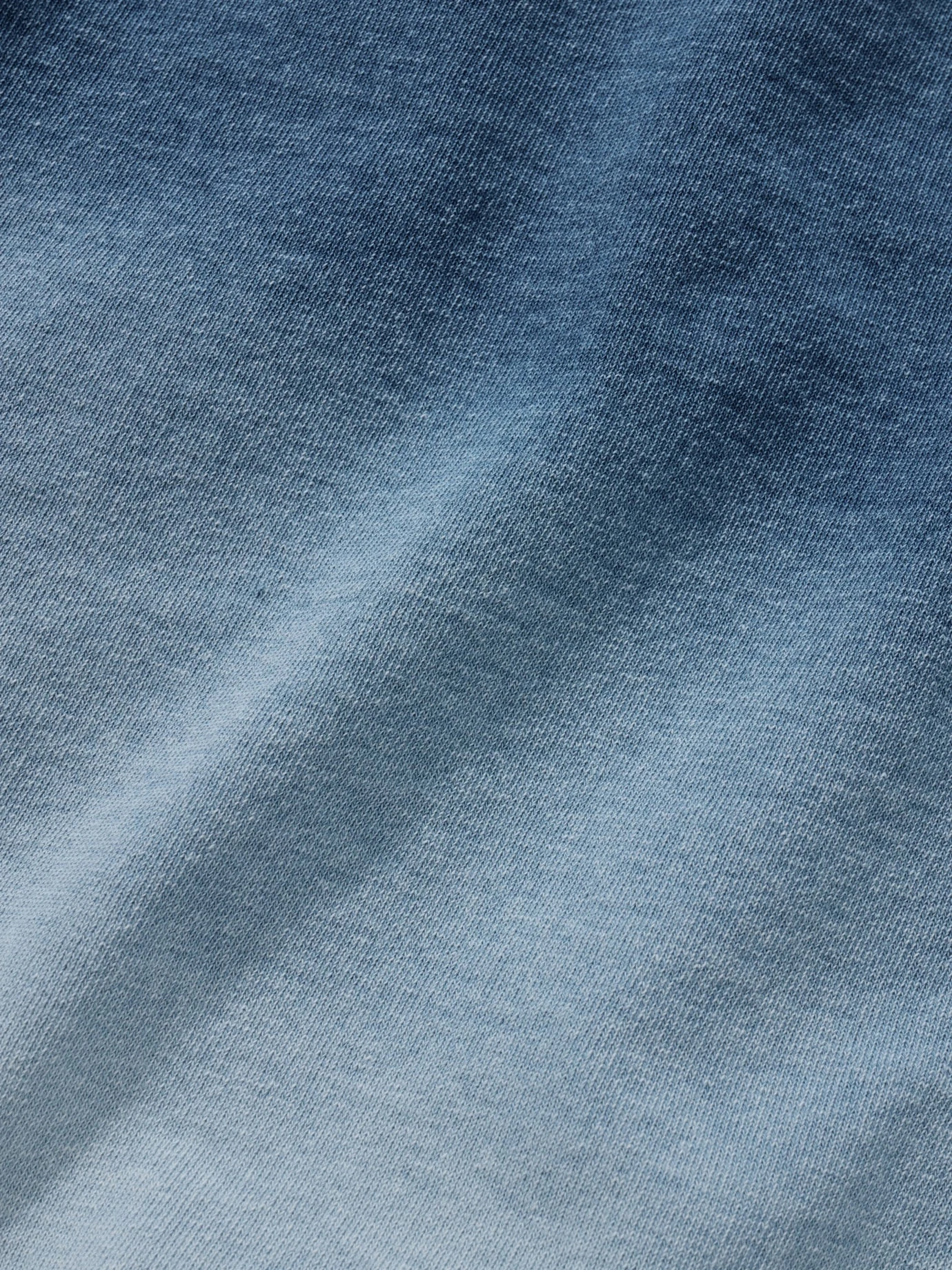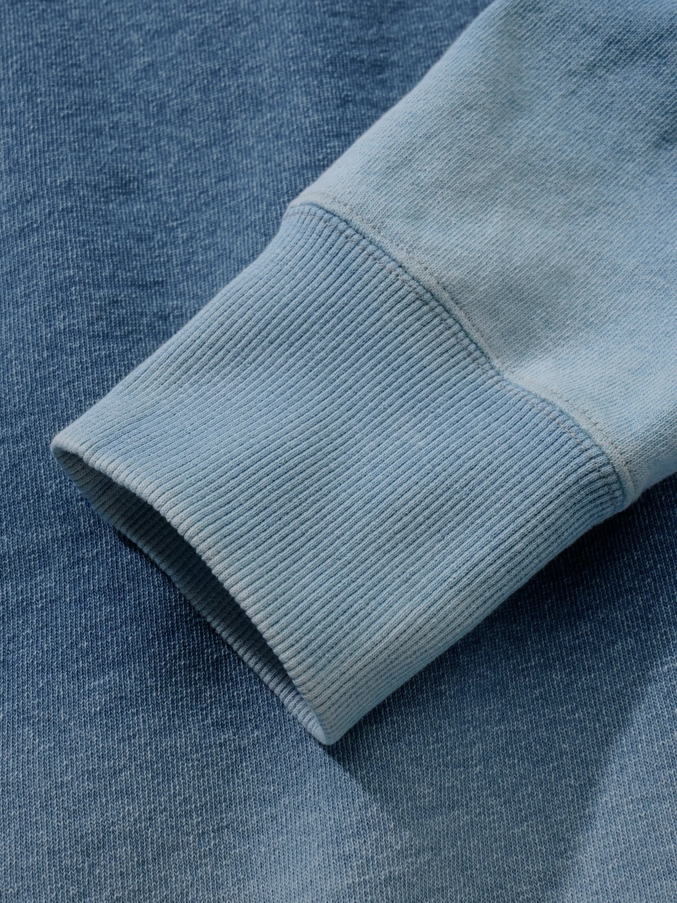 Das richtige Sweatshirt für Männer, die gern Jeans tragen. Also für fast alle Männer. Weil der Komplett-Jeans-Look heute jedoch wenig Anklang findet, zitiert das Dessin Denim lediglich, das Sweatshirt ist nicht daraus gemacht. Aber dafür kopfüber mit Indigo gefärbt. Äußerst penibel, damit der Farbverlauf den Zeitschienen-Effekt einer guten Jeans erzielt und immer individuell ausfällt. Getragen genau dazu (je dunkler, umso einfacher die Kombination) und zu allen anderen Casualhosen. Die knöpfbare Brusttasche ist Designelement.