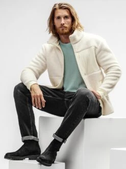 Aus der Erfahrung gelernt. Gestrickt ist er so, wie Generationen es schätzen, im Perlmusterstrick – ziemlich akkurat, ziemlich gleichmäßig und optisch edler als herkömmlicher Rechts-Links-Strick. Dass er sich so angenehm trägt und quasi natürlich nachgibt, verdankt der Pullover seiner Technik. Liegt an den fühlbaren Perlen des Stricks – sie ergeben kleine Luftpolster, die ihn ideal bis in den Spätherbst machen, für den Wärmeausgleich sorgt das richtige Verhältnis zwischen Baumwolle und Leinen.