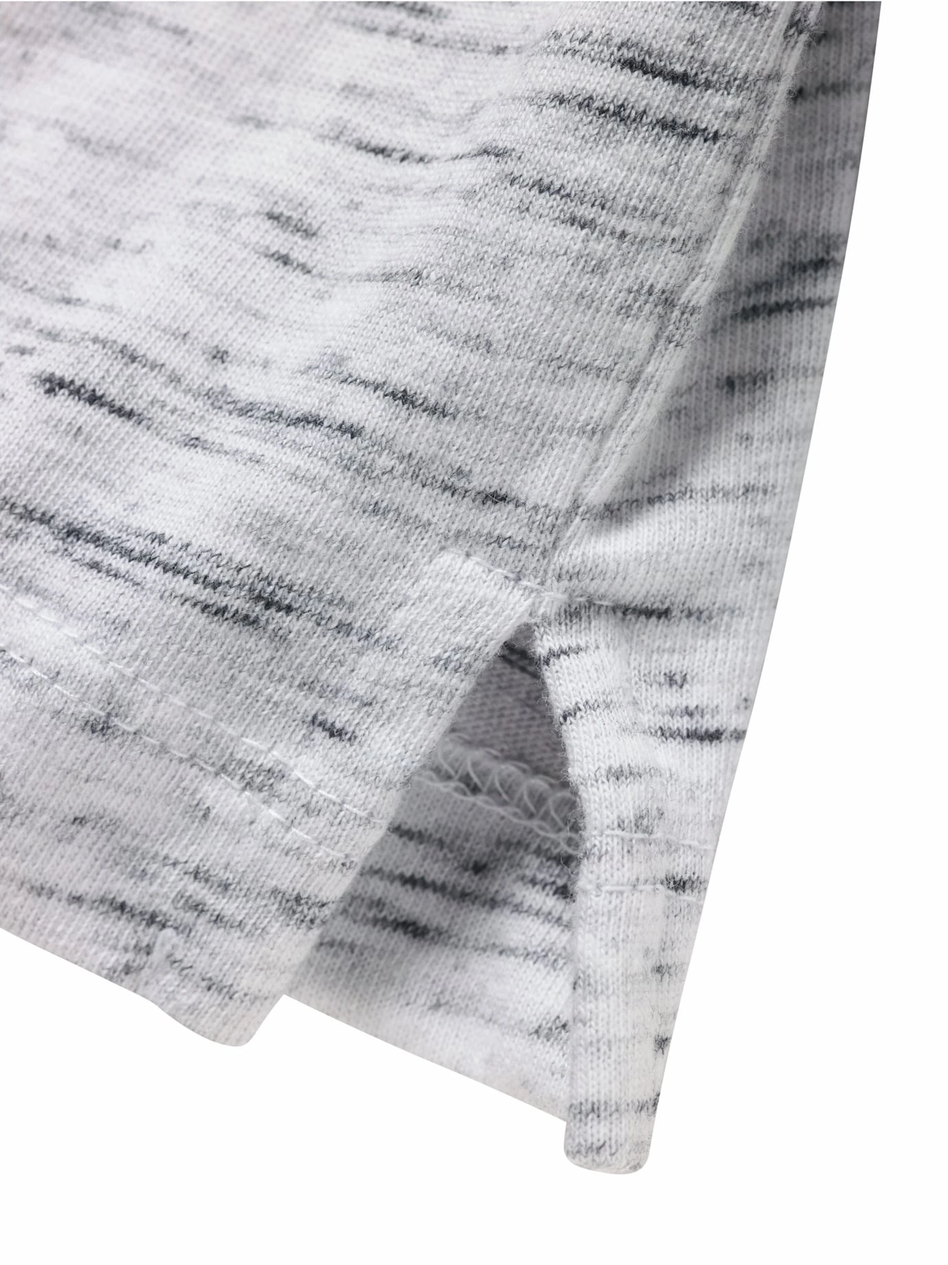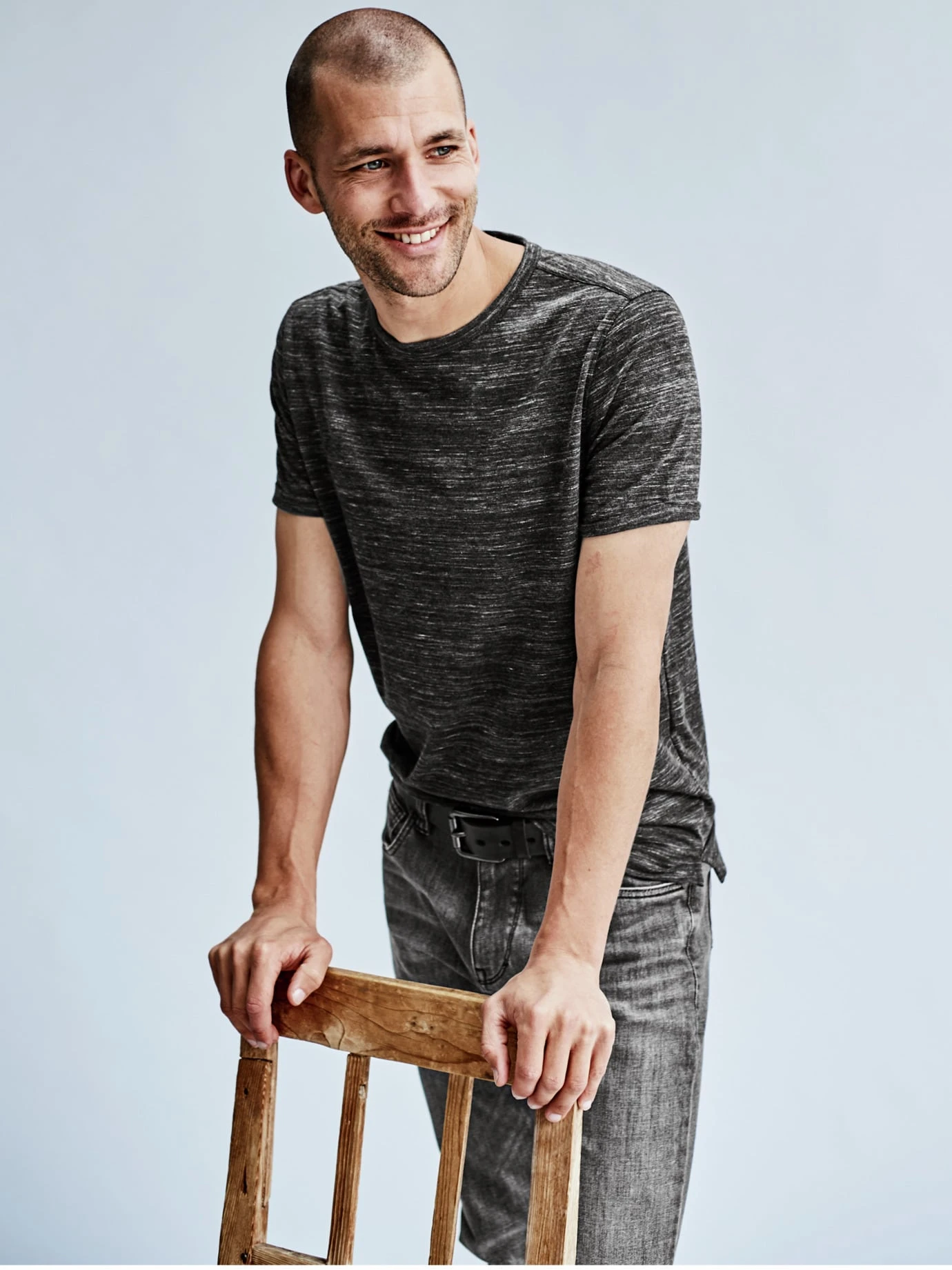 Schnittig unterwegs. Es ist das Quäntchen Hightech-Garn, welches das ansonsten aus Baumwolle gefertigte Shirt benötigt, damit per Space-Dye-Verfahren (ja, tatsächlich, „Weltraumfärbung“) die unregelmäßige Struktur erzielt wird: Mit rund 4000 Metern bedrucktem Garn pro Minute erfolgt der Färbevorgang dabei annähernd so rasant wie der Start einer Rakete ins All mit mindestens 7,9 km pro Sekunde. Sportlich!