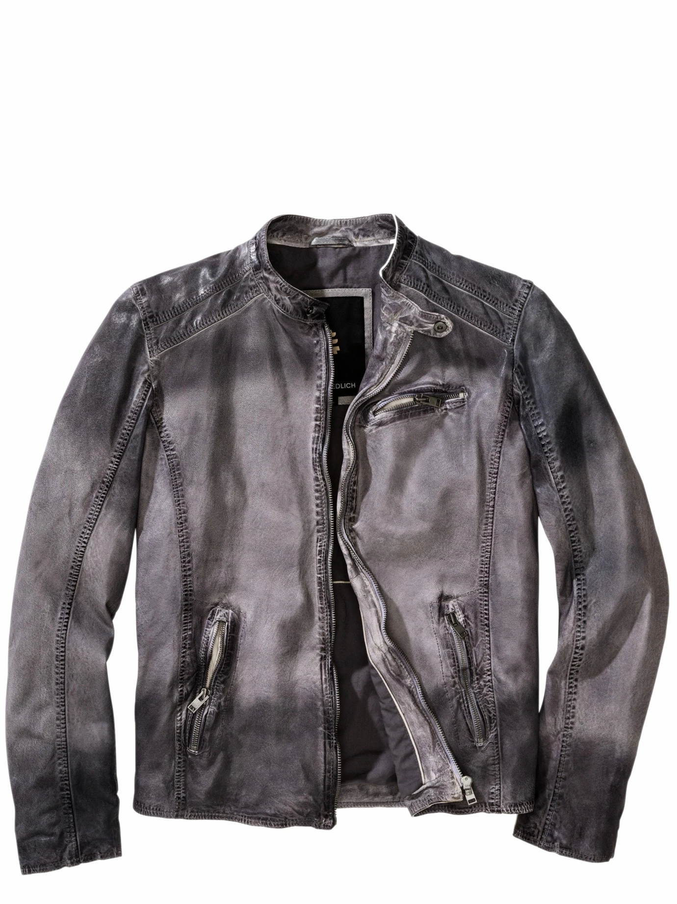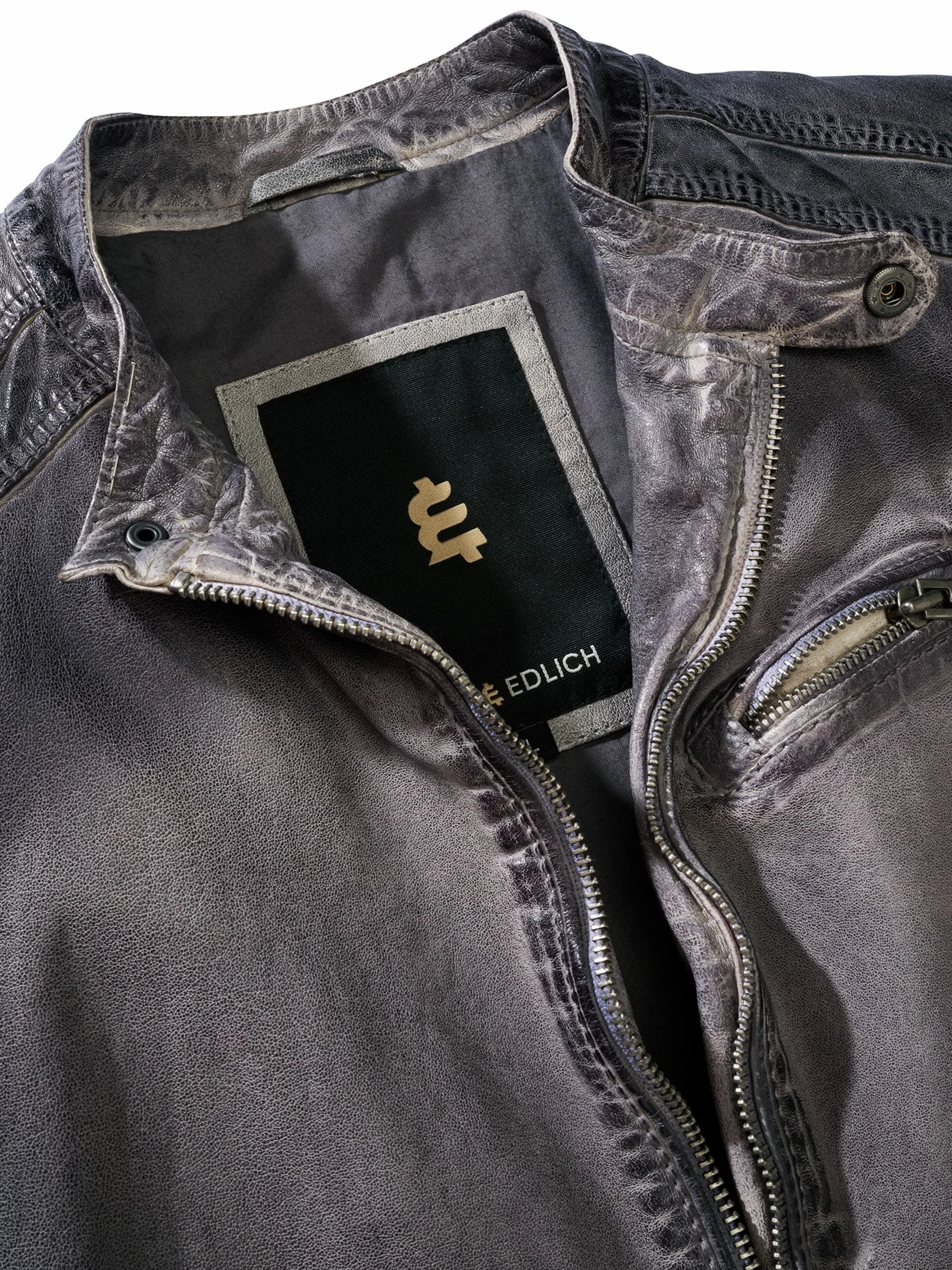 Weiches Lammnappa mit der Attitüde echten Lebens. Den Look erhält die fertig genähte Jacke durch eine Spezialfärbung – genau das Richtige für alle Fans des kernigen Biker-Stils, die sich sonst sattgesehen haben am typischen Uni-Ton klassischer Lederjacken. Passend dazu: die fetten Metallreißverschlüsse, der Druckknopf am Kragen, die solide Rückensteppung und die kernigen Nähte dort, wo sonst echte Protektoren sitzen. Stilecht in Grau-Grau-Kombinationen oder mit enger Jeans und derben Boots.