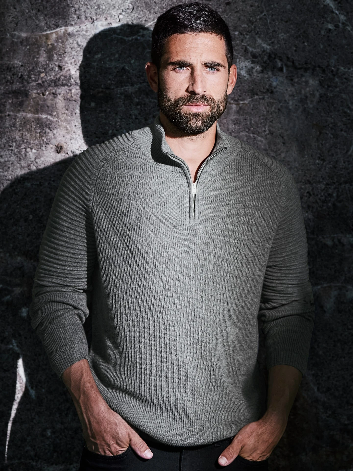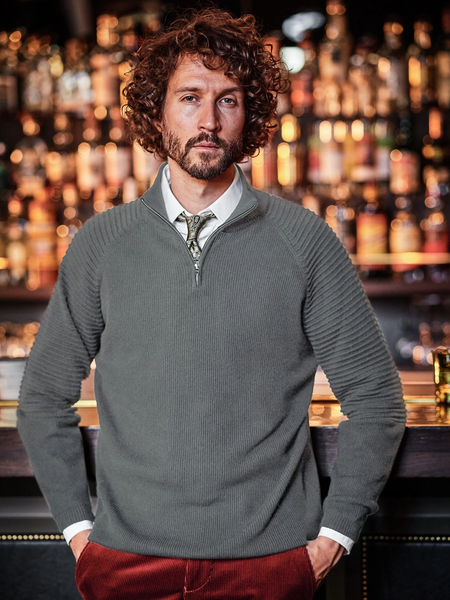 Den Sprung vom Fischerboot an Land hat der Troyer längst geschafft. Statt wie das Original aus kratziger Schurwolle ist er jetzt italienischer durch eine Mischung aus viel atmungsaktiver Baumwolle, für den richtigen Anteil Wärme sorgt ein Schuss Wolle. Der hohe Kragen samt Zipper ist eine Art Klimakontrolle: geöffnet für drinnen, geschlossen für draußen, besonders, wenn der Wind auffrischt. Die Raglanärmel im Protektorenstil sorgen für durchtrainierte Schultern. Am liebsten derb kombinieren: mit Jeans oder Chino, Hemd oder T-Shirt, Boot oder rahmengenähtem Schuh.