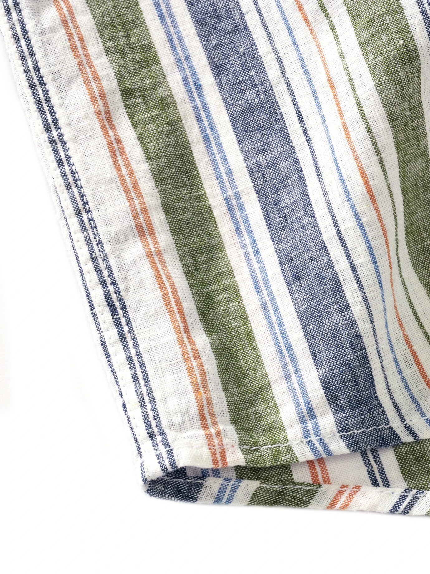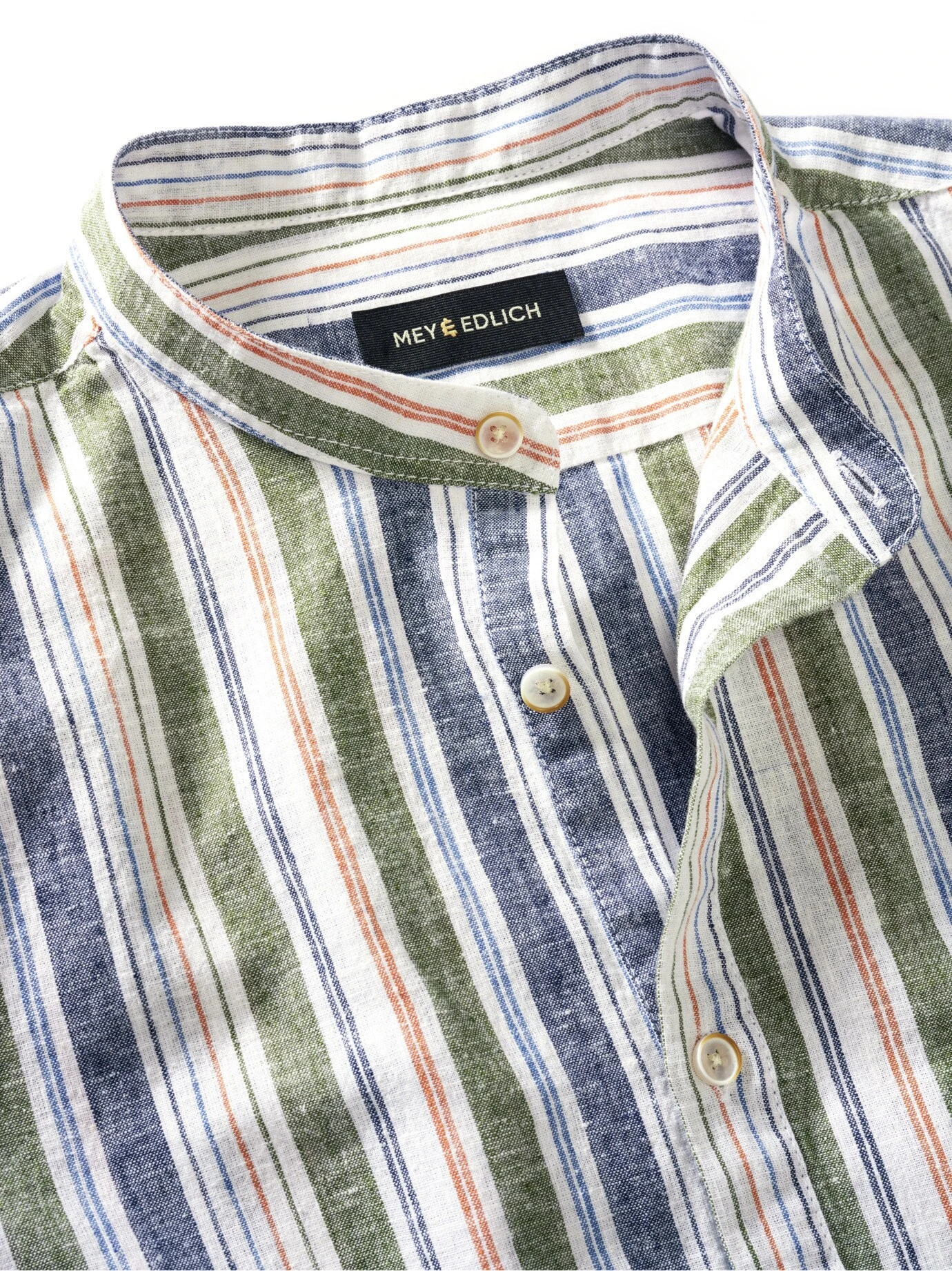 Gut wie damals. Vom Ursprung ein Schlupfhemd, wie es früher die Männer bei harter Arbeit bevorzugten, da es schnell über den Kopf gezogen war und genug Platz zum Werkeln ließ. Heute trägt es einen anliegenden, kurzen Ärmel, den neuen Maßstab setzt der Stoff: Viel Leinen macht es bei Hitze unschlagbar, die Baumwolle lässt Sie drunter frisch aussehen (schlägt nur sanfte Knitter). Mit hochwertig eingewebtem Streifen, der beim Weben zwar Zeit veranschlagt, farblich aber beeindruckt.