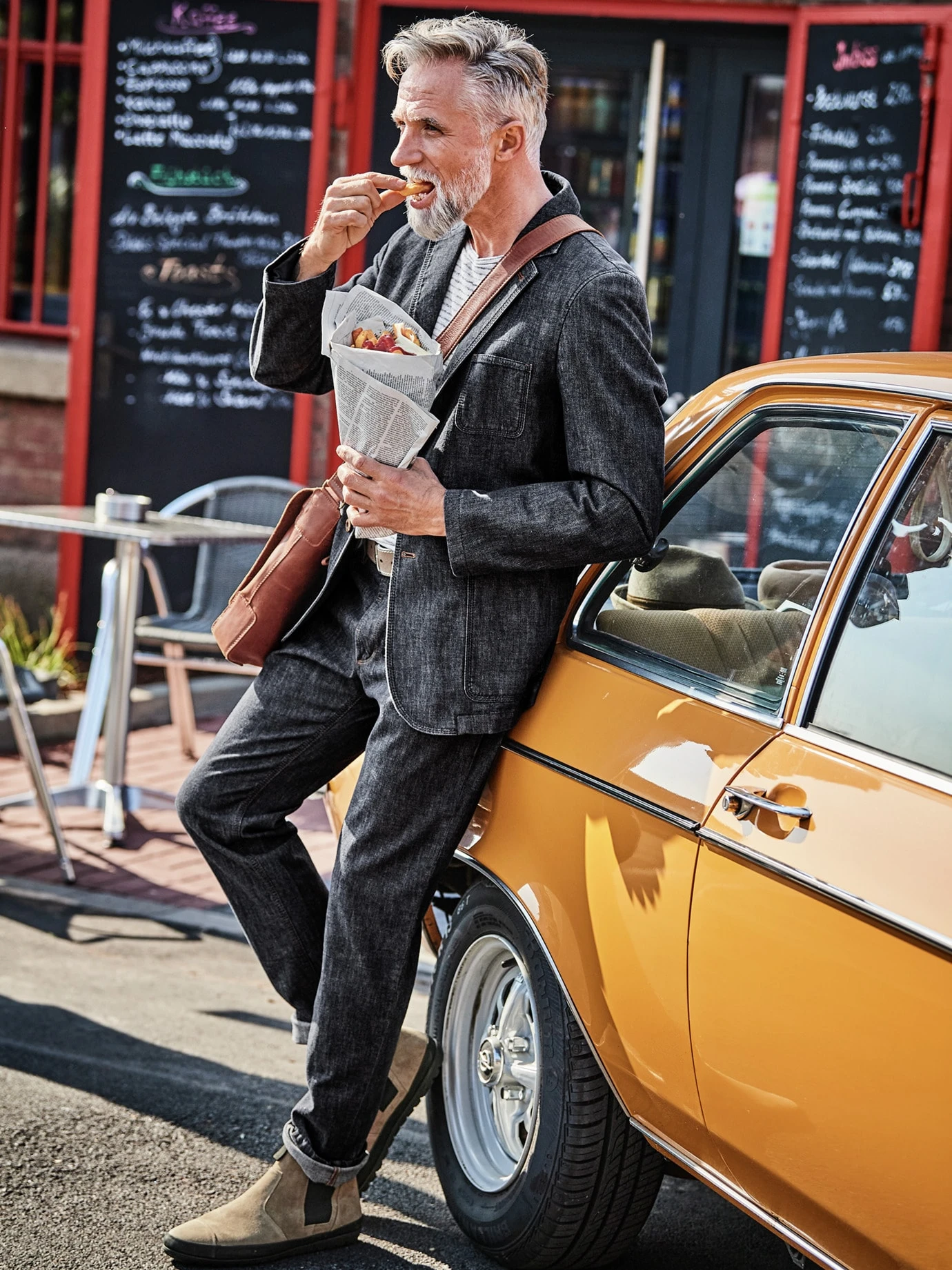 Punktet auf den zweiten Blick. Auf den ersten Blick ist es eine klassisch gerade, tiefdunkle Raw Jeans, eine aus der Kategorie Vermittler im Kleiderschrank. Was Sie später dann fühlen und spüren, ist der clevere Materialmix. Der Wollanteil kühlt, wenn es zu warm wird, und wärmt, wenn die Temperaturen sinken. Zusätzlich trägt das italienische Gewebe einen gehörigen Anteil Nachgiebigkeit in sich.