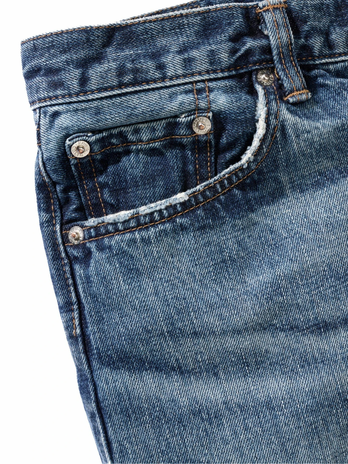 Jeans-Kenner schätzen ihre Authentizität, ihr Gewicht von immerhin 13,5 oz, ihre (vor allem anfängliche) Festigkeit, ihre individuelle Anpassung nach mehrfachem Tragen. Der ausgewählte Nihon Menpu Black Rainbow Selvage Denim macht die Jeans so besonders, stammt aus Japan und wird nur noch auf einer Handvoll aus den USA importierten Webstühlen produziert. Ihrem etwas tieferen Sitz und dem ab Kniehöhe schmaler werdendem Bein verdankt sie ihren entspannten Schnitt. Klassiker und Lieblingsstück zugleich.