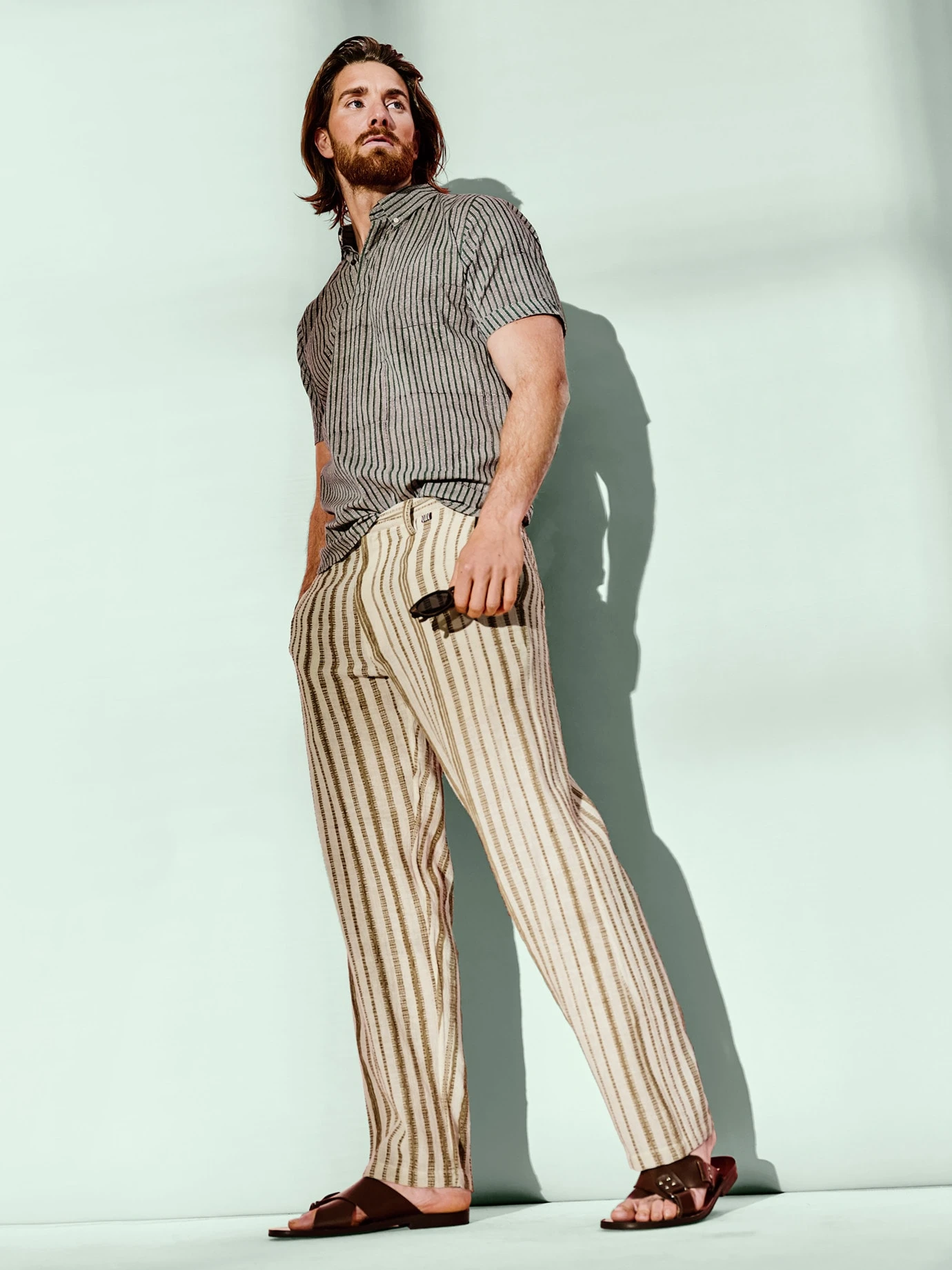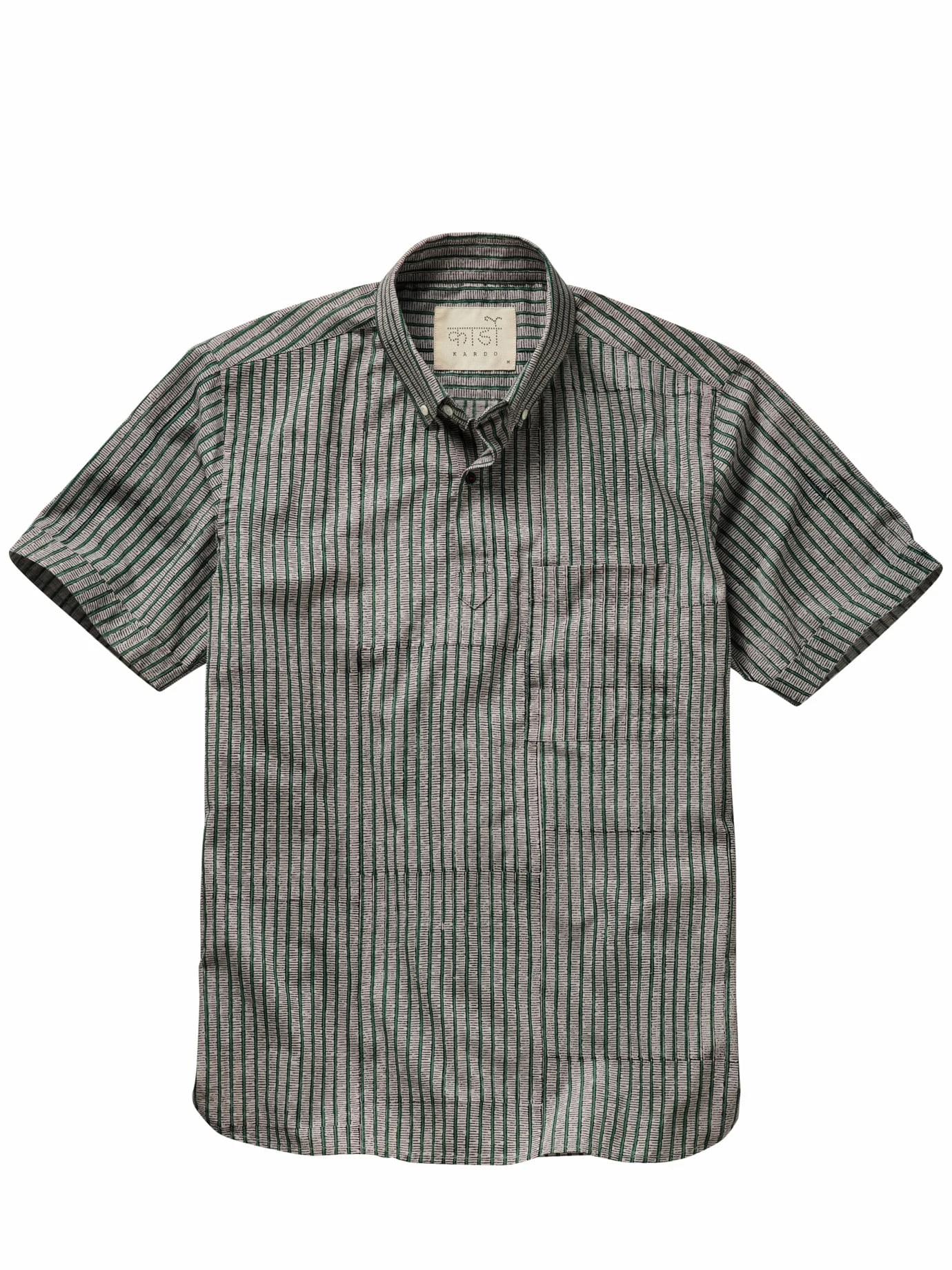 Hommage an die Handarbeit. Die traditionelle indische Drucktechnik Ajrakh stammt aus einer Zeit, als man Muster noch mit handgeschnitzten Teakholz-Blöcken auf die Stoffe brachte. Feine vertikale Linien markieren auf diesem Shirt die Übergänge von einer Stempelfläche zur nächsten. So hat Kardo mit modernen Mitteln ein handwerklich inspiriertes Kunststück zum Anziehen geschaffen. Passt sogar zu gestreifen Hosen (nur Mut) und Ledersandalen.