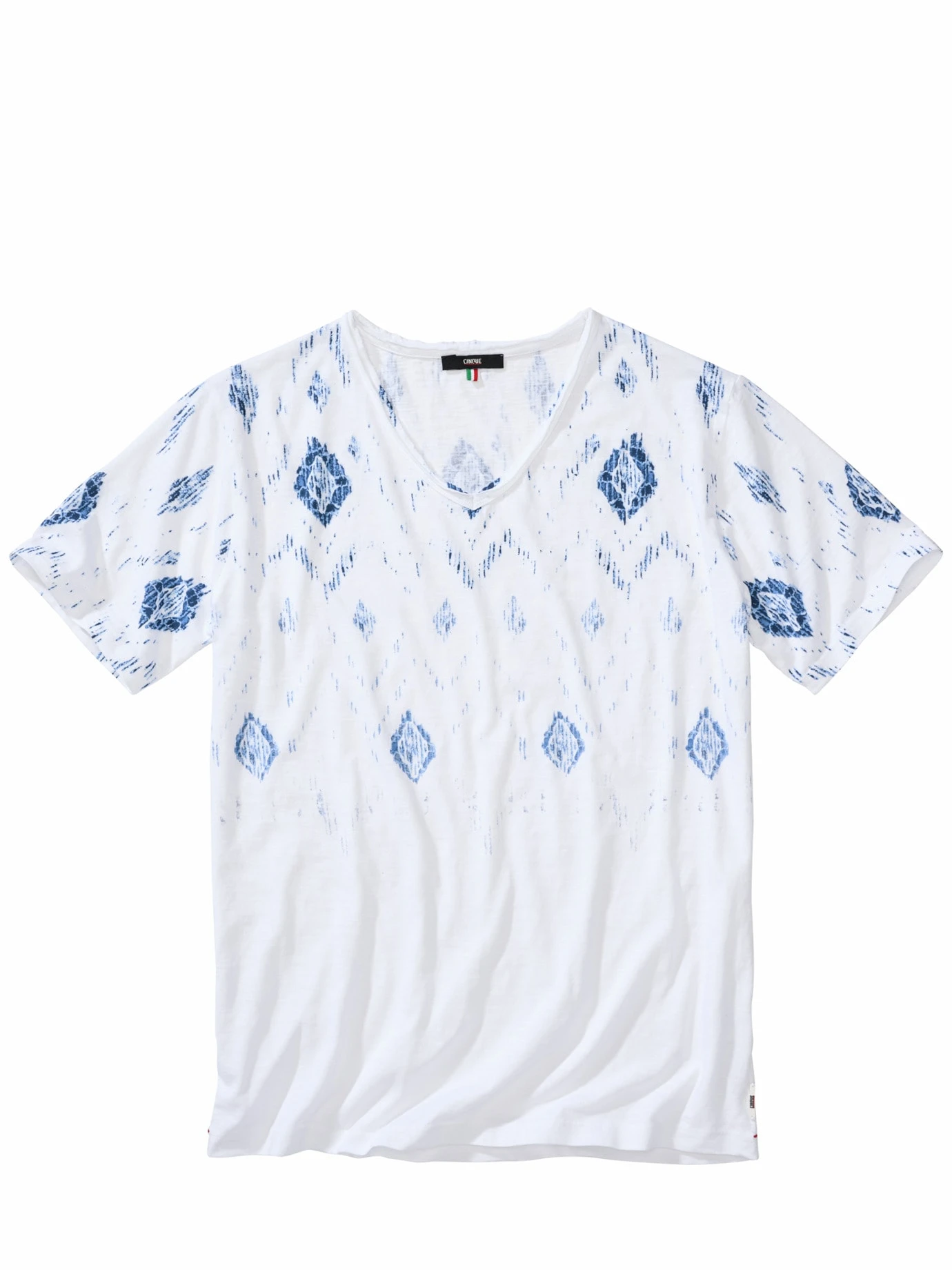 Mehr als zum Bestaunen. Die Ornamente wirken, als hätte ein T-Shirt-Macher sich an jahrhundertealter Porzellankunst probiert. Tatsächlich platziert CINQUE per moderner Drucktechnik die Ornamente aufs Shirt. Den leicht verschwommenen Effekt verantwortet ein Flammégarn. Es ist fühlbar unregelmäßig, dadurch nimmt es auch die Farbe unterschiedlich stark auf. Passt angezogen zu jeder Sommerhosenfarbe.