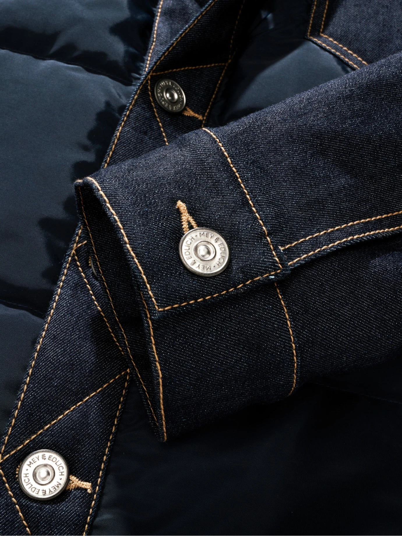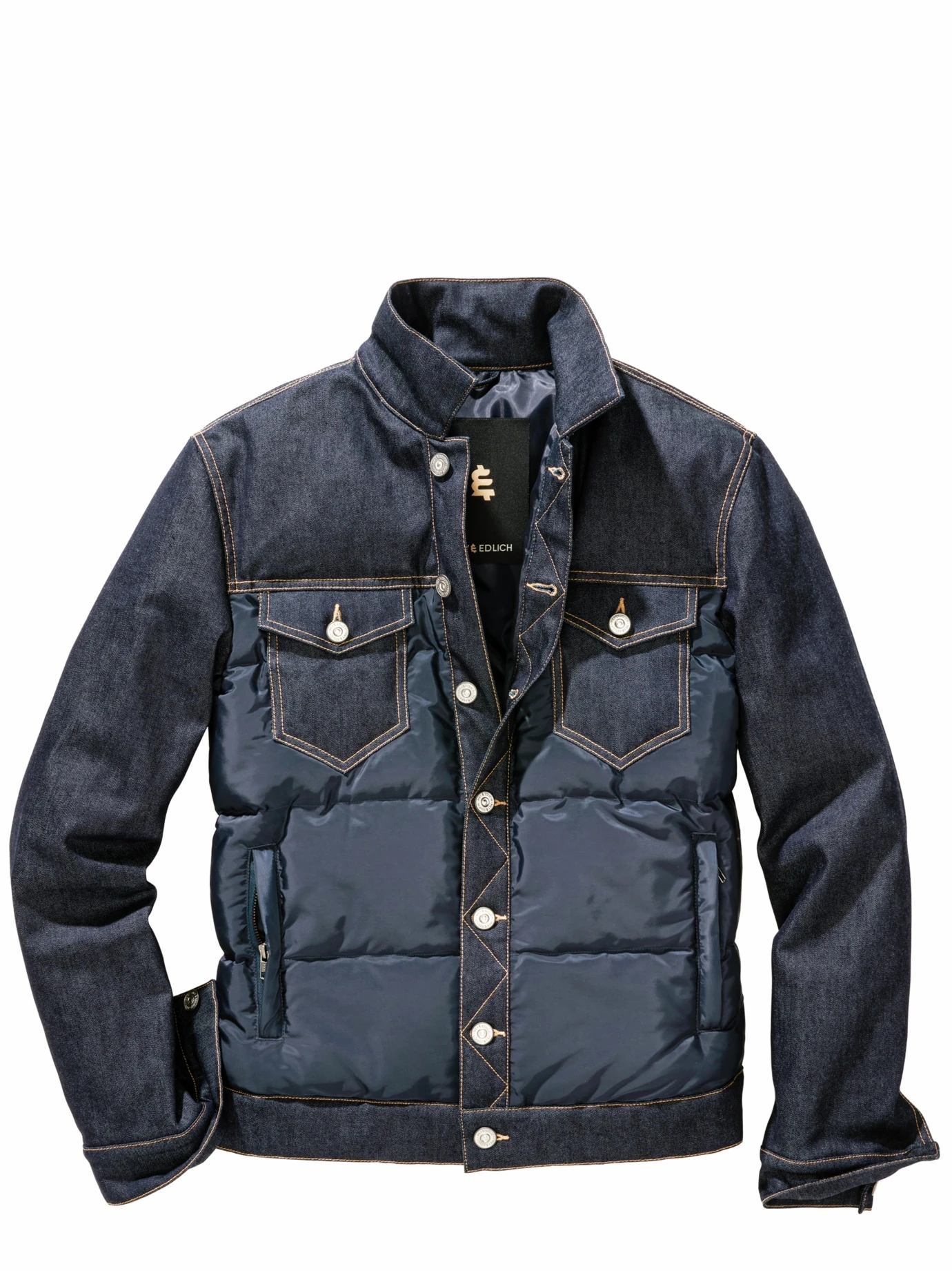 Endlich taugt die Jeansjacke an kälteren Morgen, ansonsten bleibt sie ganz in ihrem Element: gerade im Schnitt, hüftlang, mit Knopfleiste und Kragen sowie zwei Eingriffs- und Brusttaschen. Aus Mailand stammt der Entwurf, der die smarte Materialkombination neu erfasst und zu einem einzigartigen Crossover-Hybrid aus rauem Denim und modernem City-Look zusammenfügt – funktionell und wärmend wattiert für die kälteren Tage. Lässig zu Sweatshirt und T-Shirt, konsequent mit hellerer Jeans oder Cargo. Ob dann mit soliden Sneakern oder derben Boots, entscheiden Sie – oder das Wetter.