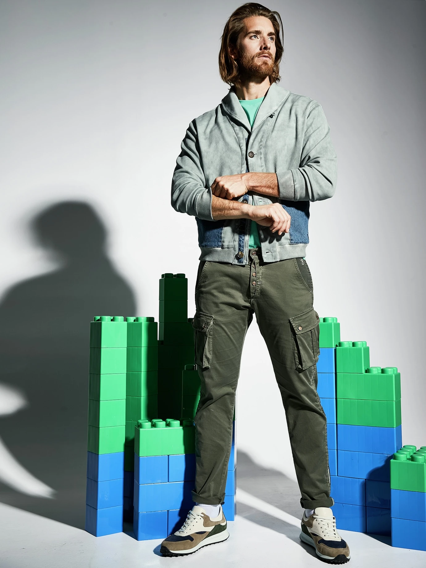 Scharfer Grenzgänger. Weder Jeansjacke noch Cardigan. Eine Jacke mit Alleinstellungsmerkmal. Barb’One wäscht sie so lange, bis sie verdammt weich ist und verdammt eingelebt aussieht. Typisch für die italienischen Designer: die abgesetzten Details, wie die Jeanstaschen, die Jeansknopfleiste oder aber die fetten Knöpfe in Holzoptik. Dazu passt ein schlichtes T-Shirt oder Longsleeve, bei der Hose können Sie gern mehr PS drauf geben.