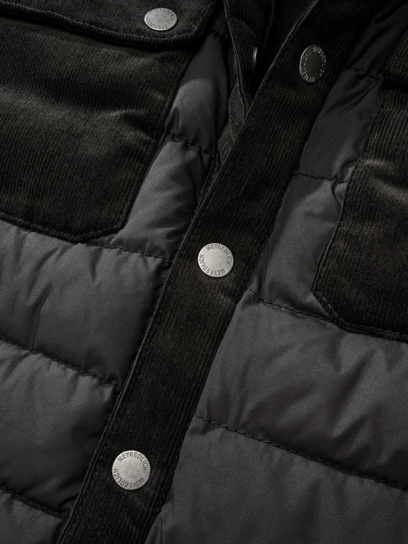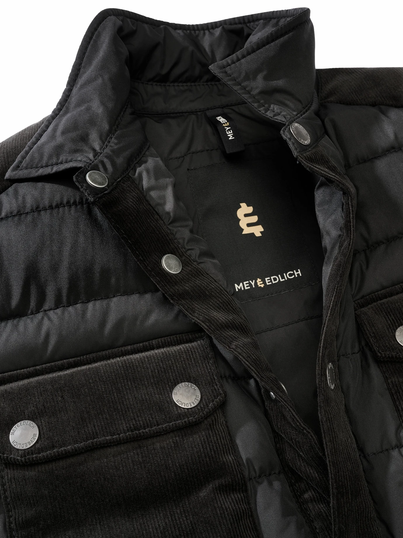 Im vorteilhaften Schnitt eines Hemdes kommt dieses wärmende Jacket mit Quersteppungen um die Ecke. Es bietet sich als unerschrockenes Basic für die Smart-Casual-Herbst-Winter-Saison an. Geblieben sind Knopfleiste, Kragen, aufgesetzte Brusttaschen und ein gerader Schnitt ohne Bündchen. Besätze und Taschen aus dunkelkernigem Cord bescheren dem technischen Oberstoff einen markigen Charakter. Die Steppnähte halten das Futter an Ort und Stelle. Auf die Jacke ist Verlass, gerade wenn die Temperaturen noch schwanken: ideal fürs Layering und hält warm, ohne gleich zu dick aufzutragen.