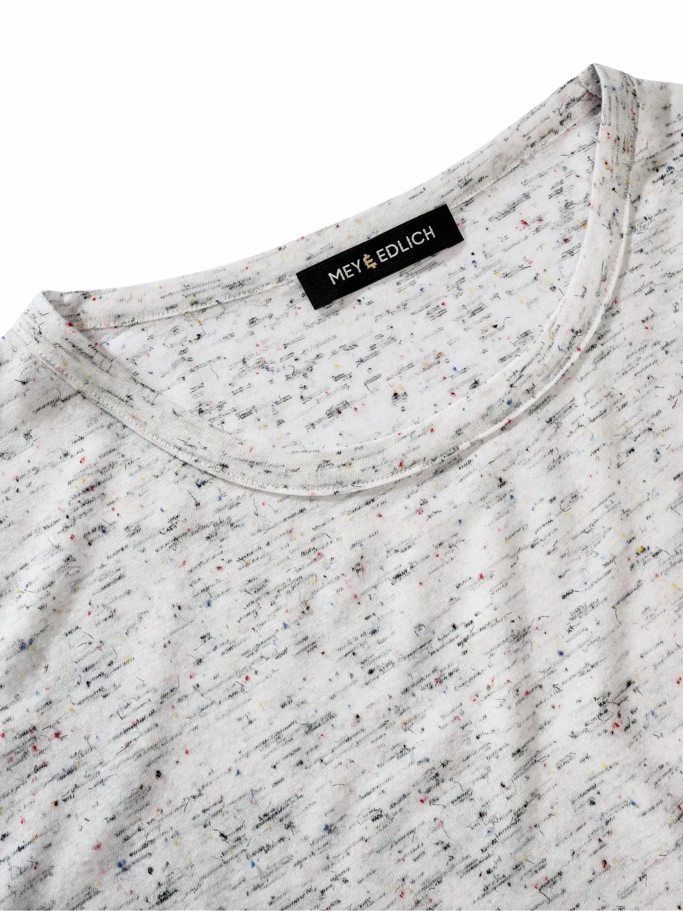 Hierin einer der schreibenden Zunft. Die werkelnde profitiert aber auch vom Shirt, da es geschmeidig anliegt, beinahe seidig. Resultiert aus dem hälftigen Viskoseanteil, der Rest ist strapazierfähige Hightech-Faser. Das Muster ist inspiriert von Zeitungspapier, entsteht tatsächlich aber durchs Garn. Damit passt es sogar zu gemusterten Hosen, am liebsten aber – klar – zur schwarzen Chino oder Blue-Jeans.